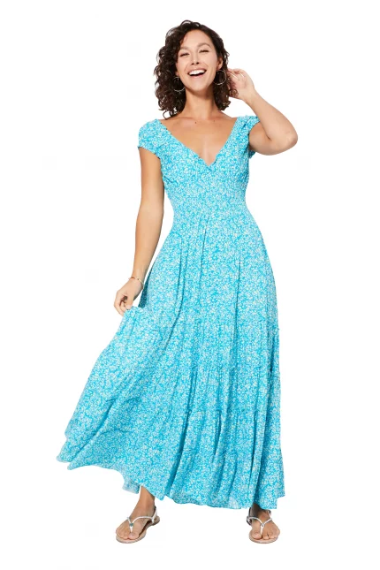 Robe longue évasée Bleue à fleurs blanches – MAXIPAV0013B