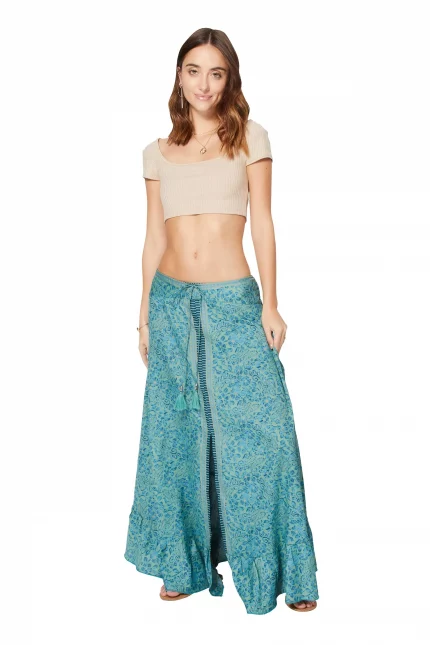 Longue jupe fluide Bleu turquoise motif végétal – JIP0048A