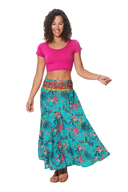 Longue jupe fluide Bleu turquoise motif végétal – JIP0048A