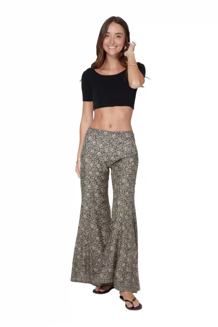 Connectez-vous pour voir les prixLe pantalon noir fleuri crème évasé de style hippie pour femme, assure une sensation de confort et de liberté pour les journées d’été.