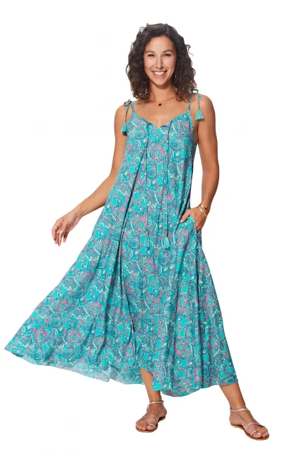 Robe longue évasée à bretelles Turquoise bohème – MAXIPA3061B