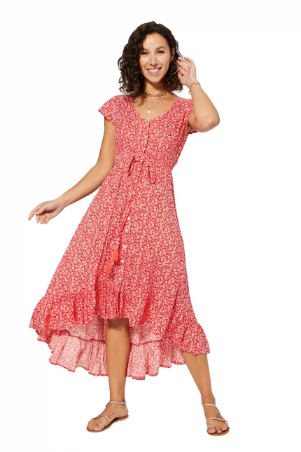 Robe longue asymétrique Rouge à fleurs blanches – MAXIPAV0014A