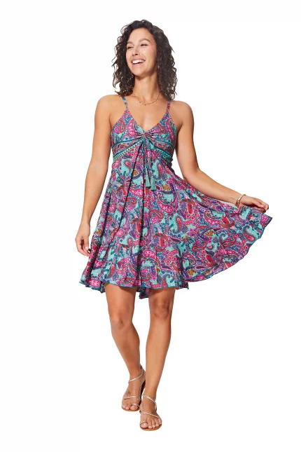 Connectez-vous pour voir les prixCette robe courte évasée turquoise à motifs bohèmes fuchsia, à bretelles, est le mélange parfait entre style et féminité, pour casser les codes tout en restant chic et tendance.