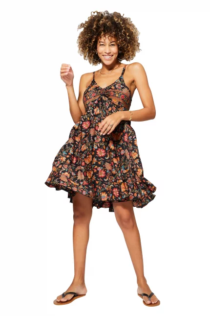 Robe courte d’été à bretelles Noire à fleurs colorées – RLIP0278E