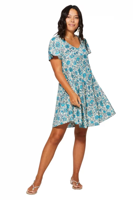 Robe courte ample bohème Bleu à motifs fleuris – RLIP0288C