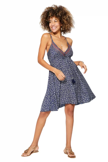 Robe courte d’été à bretelles Bleue marine à fleurs – RLIP0278C
