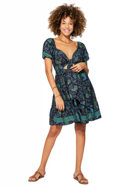 Connectez-vous pour voir les prixCette robe d’été réversible courte et évasée vous offre le meilleur avec son tissu bleu nuit à motifs bohèmes turquoise et ses manches courtes.