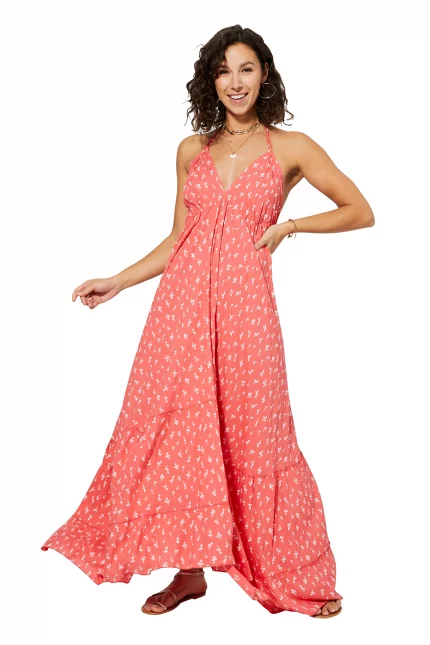 Robe longue dos nu Corail à fleurs blanches – MAXIPAV0006A
