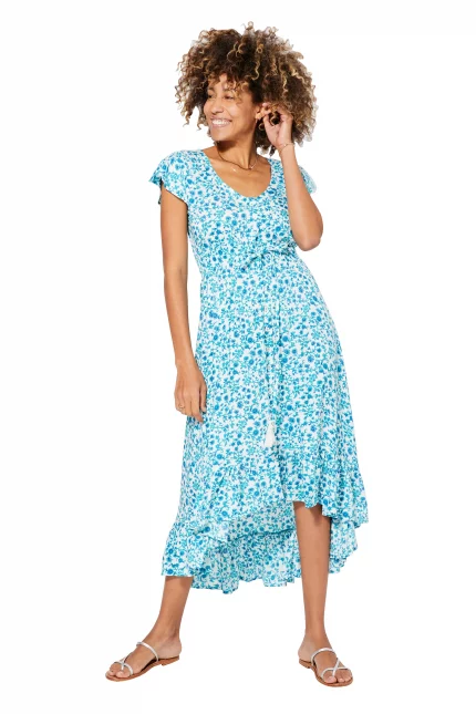 Robe longue évasée Bleue à fleurs blanches – MAXIPAV0013B