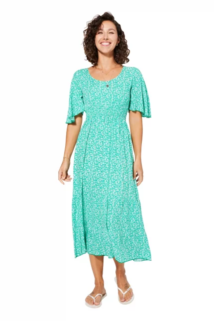 Robe mi-longue évasée Vert turquoise à fleurs – MAXIPAV0017A