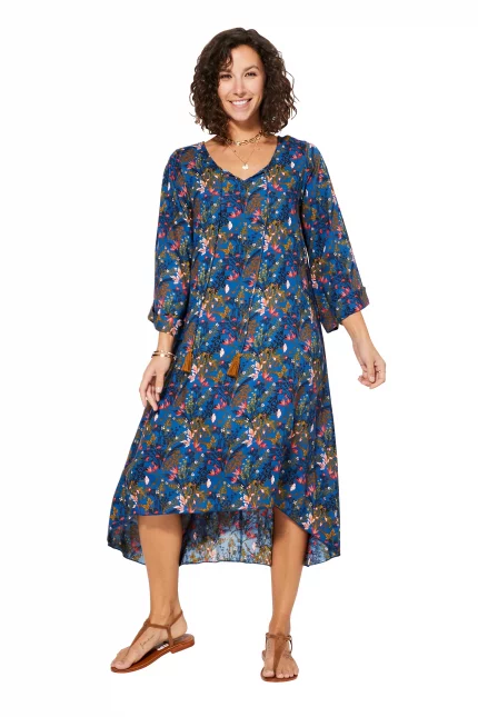 Robe ample à manches longue Bleue à fleurs – MAXIPAV0020B